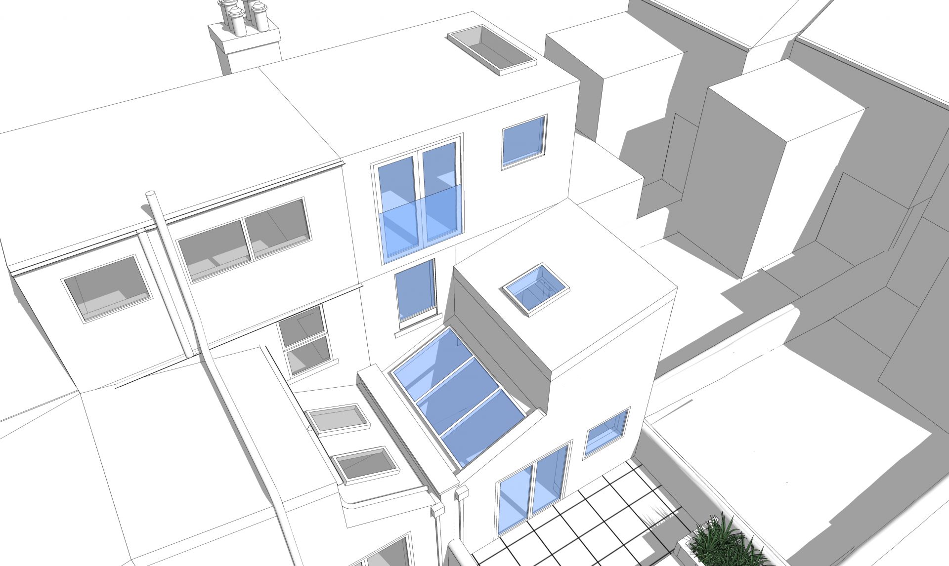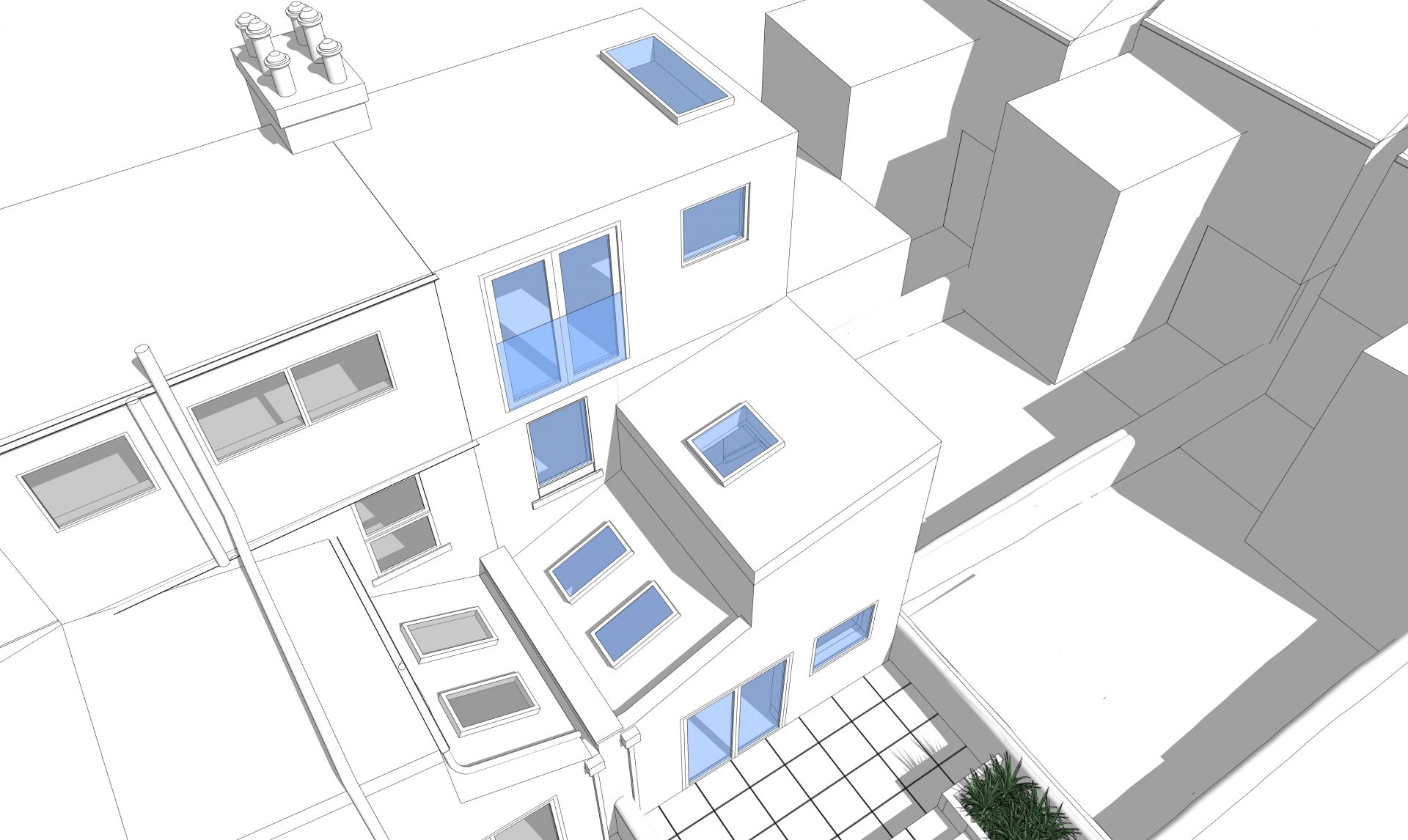Shape Architecture continues to undertake many infill extension projects throughout London and Brighton.  Below we have included images of three current infill projects in Brighton.  These 3D images give an idea of how the design and the communication with our Clients is carried out.  The use of 3D models ensures that we can communicate clearly and this is the foundation for a successful project.  We have an extensive portfolio of these types of residential project and we typically produce 5 proposals for discussion with our Clients before an agreed design is arrived at.  We pay particular attention to the use of natural light and the creation of light bright contemporary interiors.  This has been recognised by the RIBA with the inclusion of a recent project in Rugby Road – Shape Architecture’s Rugby Road project has been chosen by the Royal Institute of British Architects for their forthcoming publication ‘House goals: Work with Architects; transform your home’.
