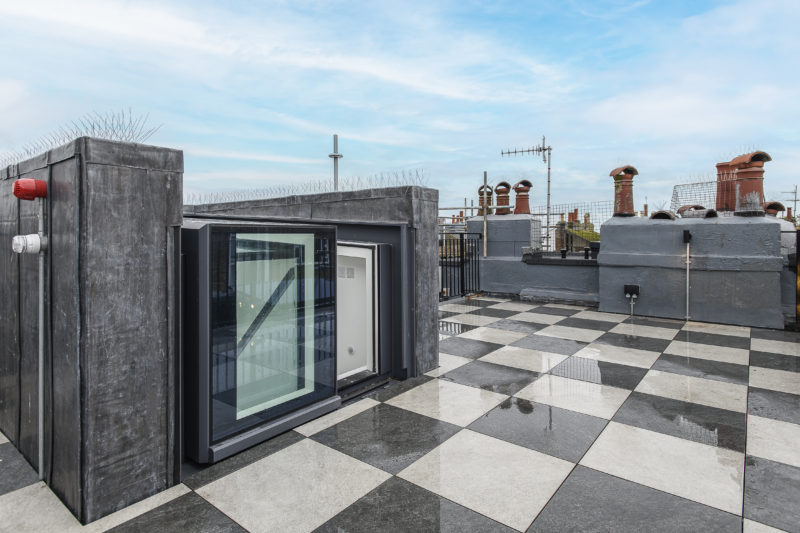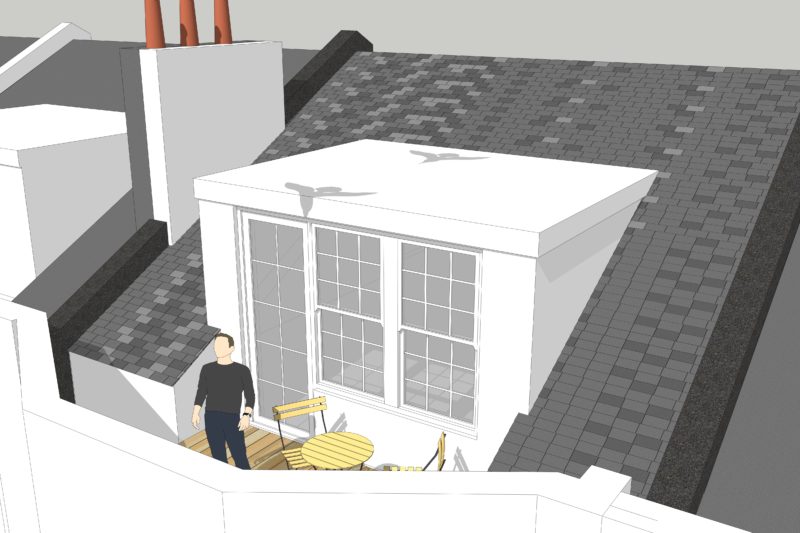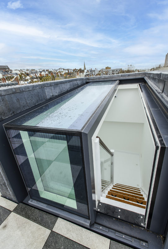Completion of a large roof terrace and rear first floor extension in prominent Conservation Area. The success of this project is in the creation of a large roof terrace with views over Brighton and the sea in addition to the upper level rear extension which adds a walk in wardrobe and en-suite bathroom to two existing bedrooms. Access to the roof terrace is via a glazed structure where one side slides over the other which also serves to floor the interior stair with daylight. Hidden doors set within bookshelves connect the new walk in wardrobe with the bedroom.