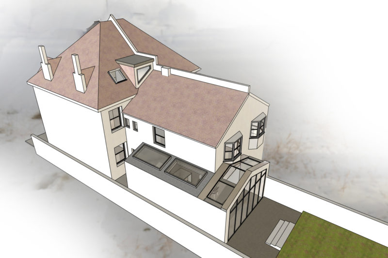 Proposals for rear extension with roof terrace . Located near our project in Rugby Road we have now designed the proposed scheme and are moving towards submitting a planning application. An existing outbuilding in a poor state and blocking any views to the garden is demolished and an elegant single storey rear extension replaces it. The extension connects well both physically and visually with the garden and also incorporates a small roof terrace.