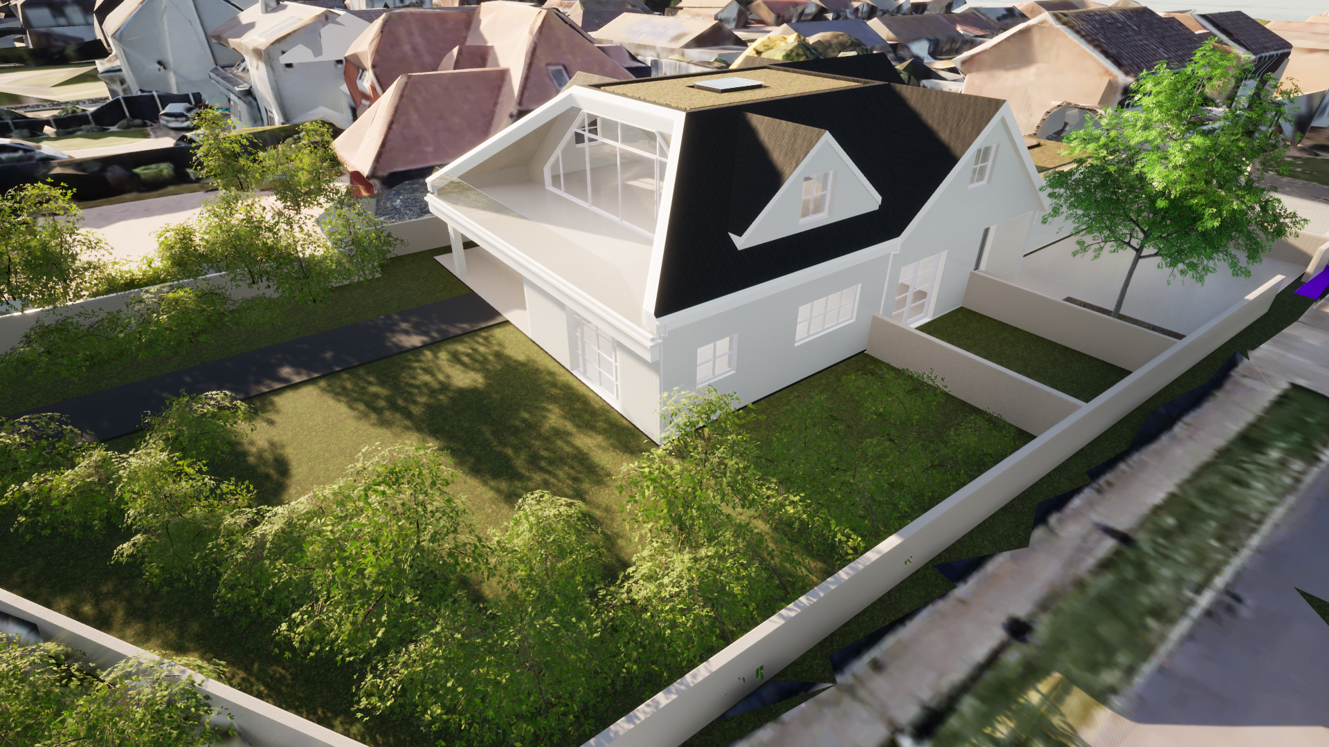 Benefiting from a generous existing floor area, the main emphasis of the proposals centres on removing the existing concrete tile roof pitched roof and raising the eaves level. A new slate roof with flat sedum roof sections and rooflights allows an appropriate ridge height against neighbouring properties. This new main feature extends beyond over the introduction of a post which extends out as a hipped section. A gable introduced in the space gives a secluded terrace.