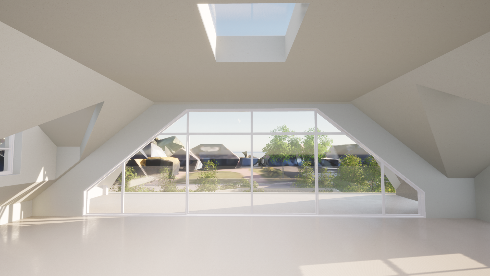 The design creates vaulted ceilings on the upper level. This geometric interest is only amplified with attractive use of large, glazed elements including a large sliding door assembly opening views across the water, as well as a glass box over a new staircase, creating a dramatic first entrance into the house.