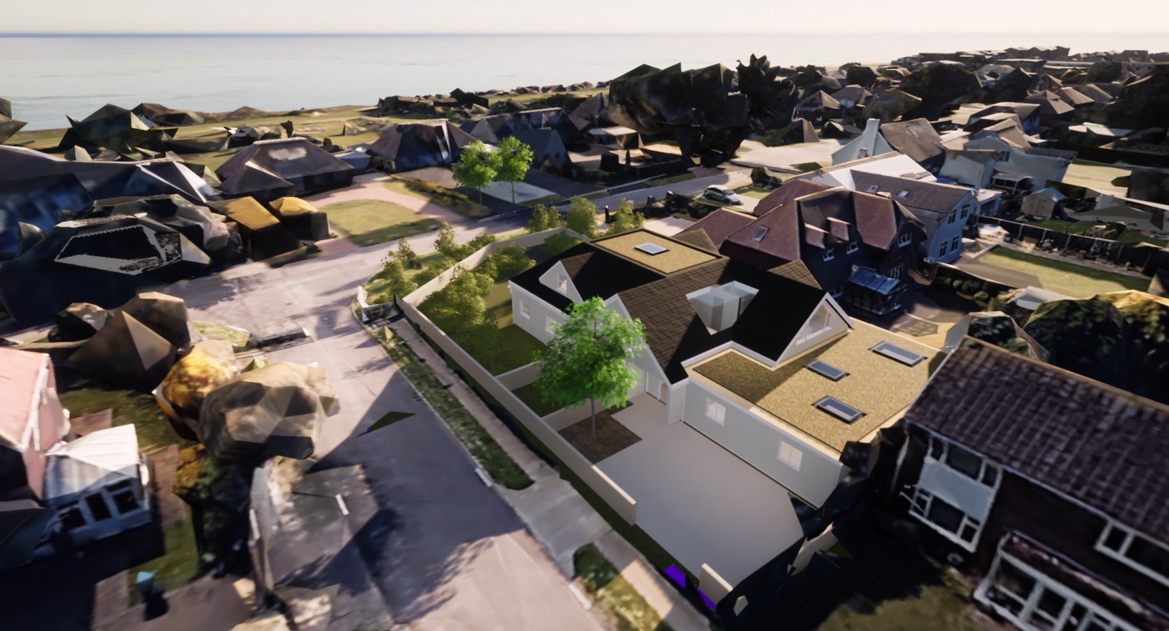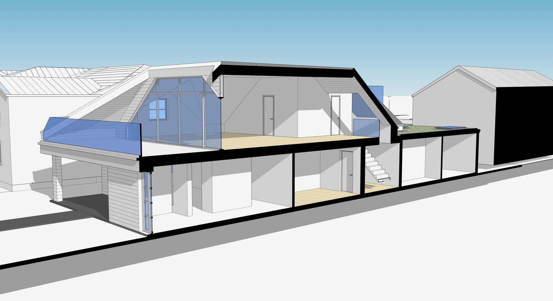 The bungalow has the potential to experience sea views- as seen on a previous blog ‘Can I see the Sea?’; this proposal offers something special in opening up a first-floor living/work space with terrace providing seamless transition from internal to external enjoying views out across the sea.