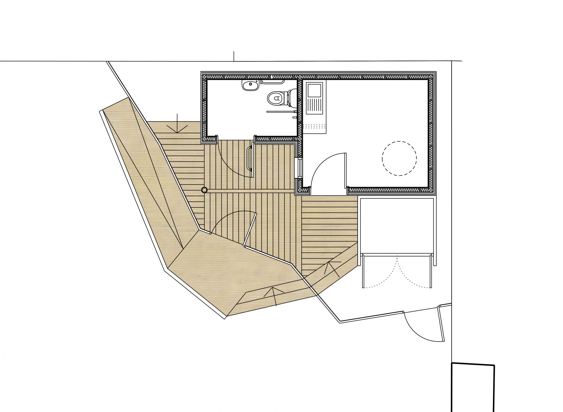 The interior to these garden rooms are all filled with light from rooflights and glazed doors and designed to be contemplative spaces, that open up onto the surrounding garden.  The landscaping around such structures does not need to be extensive and is often designed as a terrace or platform to enable its use to spill out into the garden.