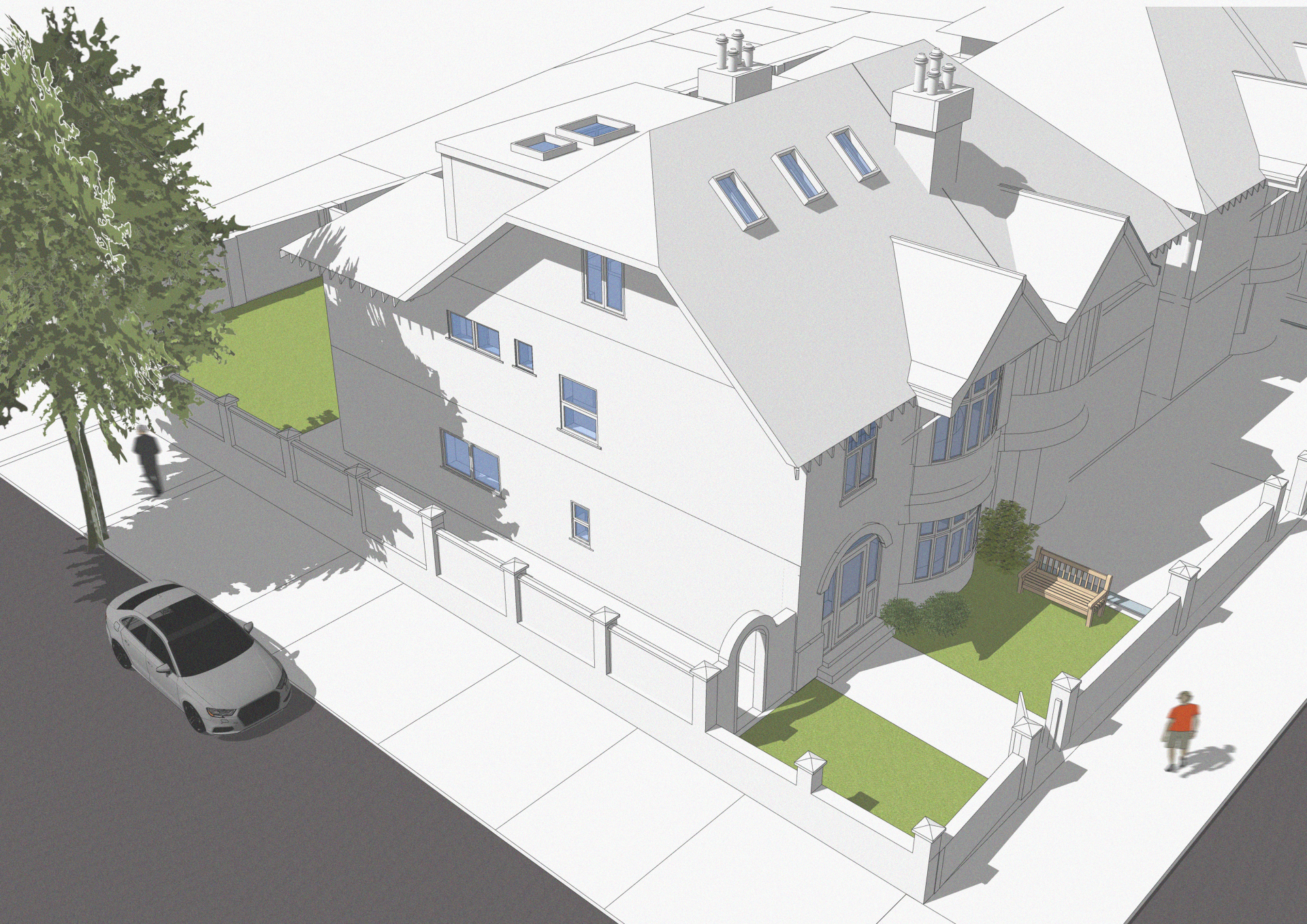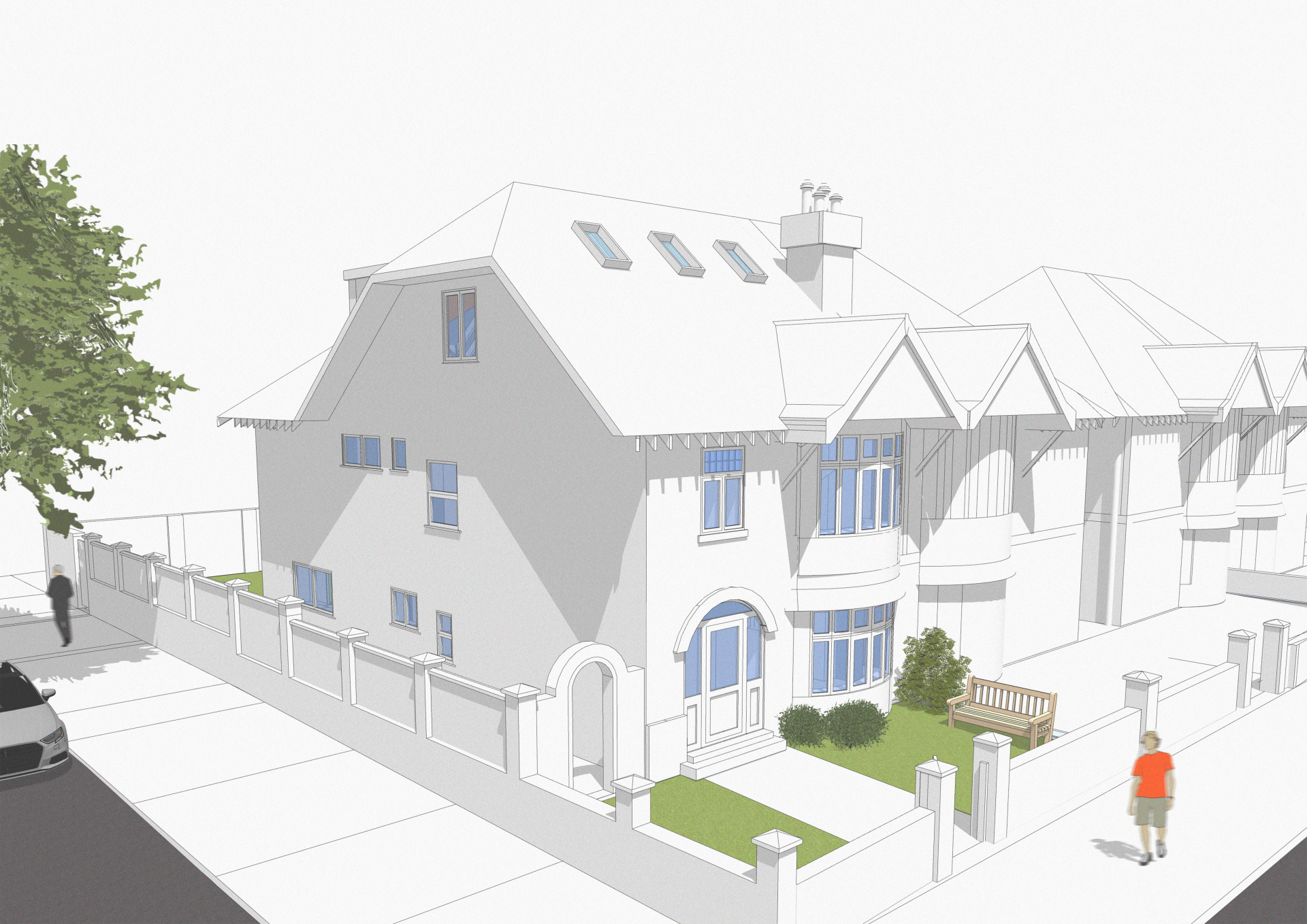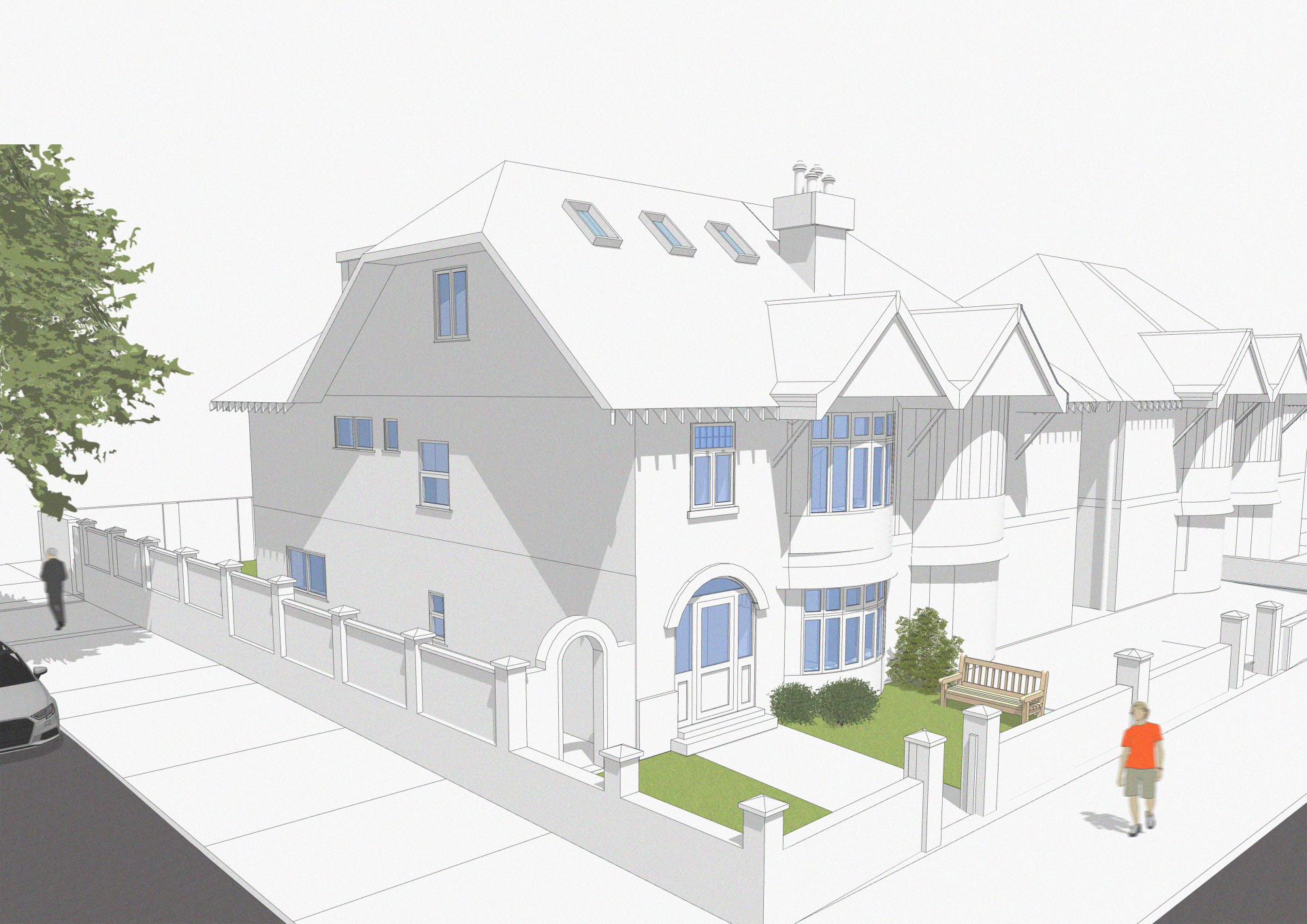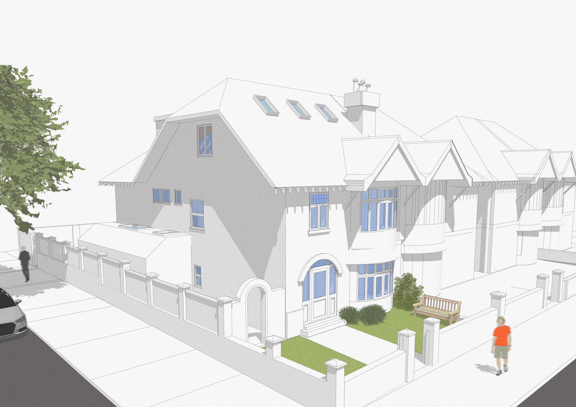 This project in Hove is at concept design stage and incorporates amongst other things a side infill extension, loft extension and hip to gable conversion. As with all our projects we provide a brochure of 5 or 6 design options all of which are explored in 2D and 3D. This is a reflection of our client’s brief and is sent by email as a PDF document. Once our client has had a chance to review, we will then visit them at their property to run through their thoughts and discuss all aspects of the proposals brochure. We will then have a preferred scheme which is developed in further detail.
