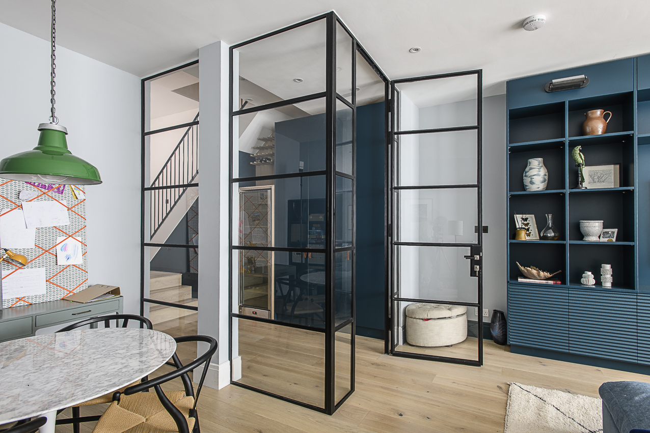 - Glass partitions separate spaces while letting natural light in