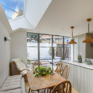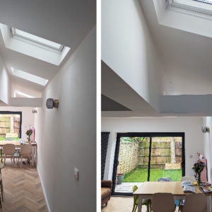 The co-opting of integral garages into habitable space can help transform a property. We have carried out many throughout London including to Mews properties where such a conversion has a big impact. The treatment of the rear extension roof with a green sedum roof creates an attractive roof finish that blends in with the garden when viewed from above.