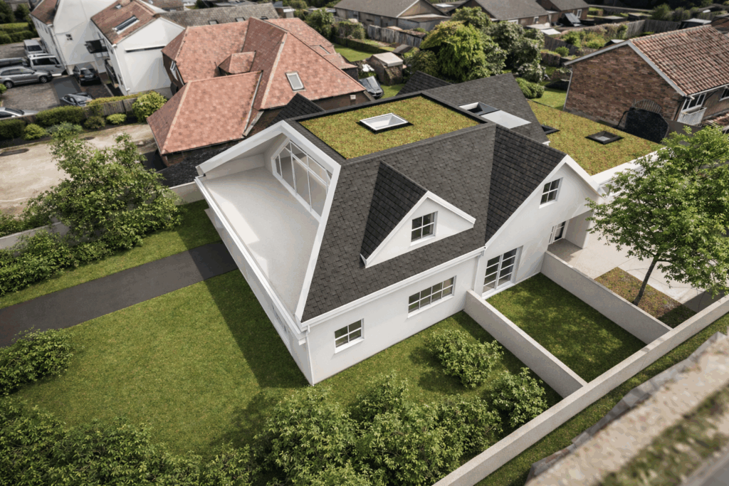 Our project in Rustington is a good example of how a bungalow can be transformed. The extension into the roof is key. Here 3D modelling helped us exploit the geometry and available space and ensure an efficient design. Ground floor extensions around the foot print also allow elegant roof lights to be introduced over large and contemporary light filled rooms. Double height spaces can be introduced with the loft floor removed and Velux roof lights set over.