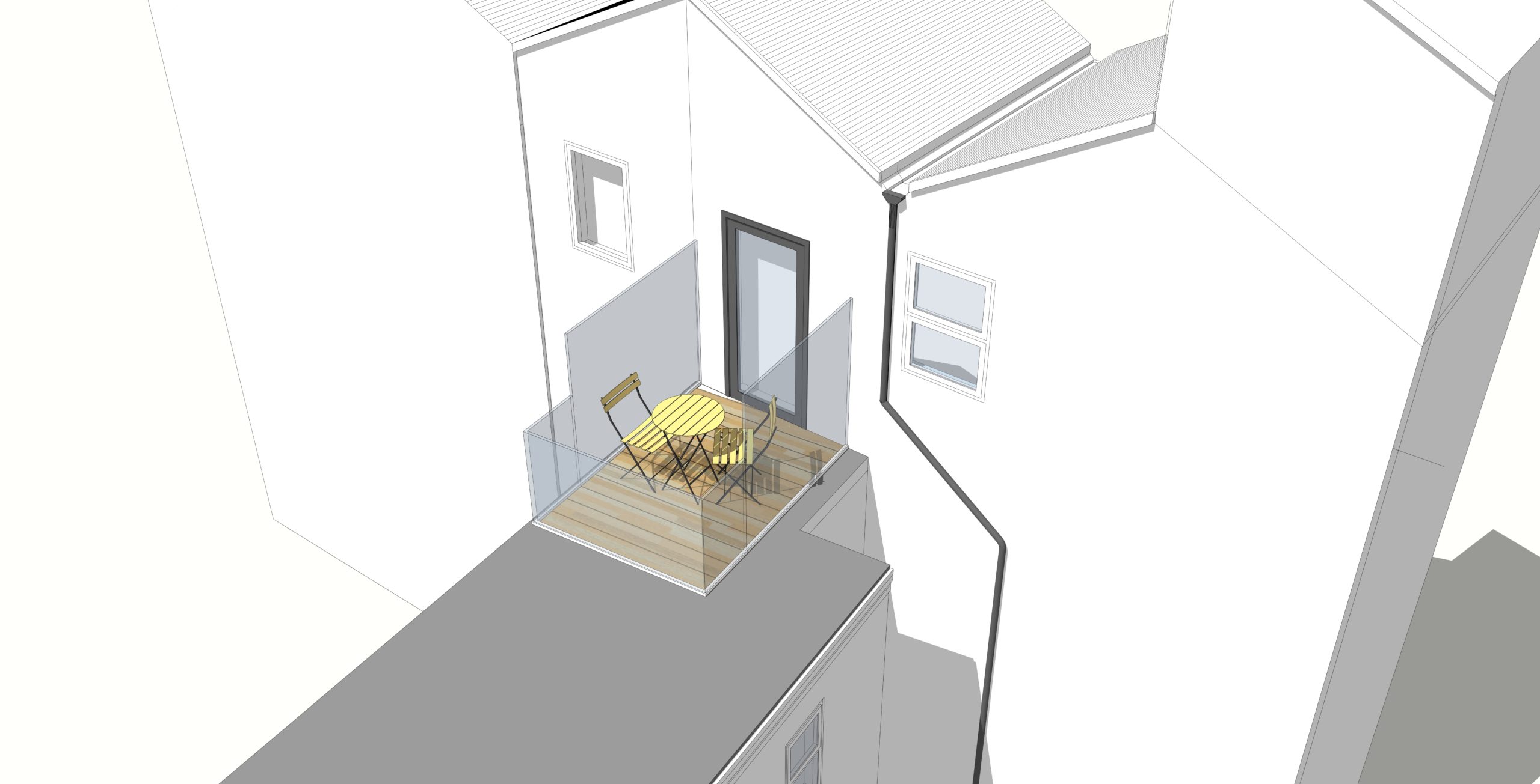 Here we have added a roof terrace giving valuable external space to an upper floor duplex flat.  The addition of a roof dormer provides additional space and access onto the roof terrace.  As an upper floor flat our Clients previously had no garden space to use.  This project is much like the roof terrace added to a flat overlooking Clapham Junction.  One of our first roof terrace projects.