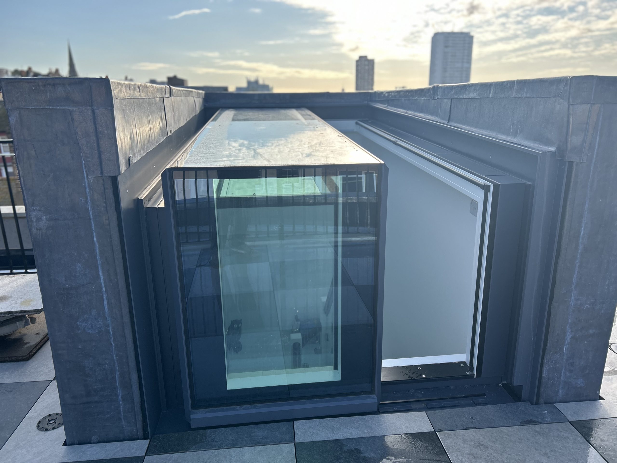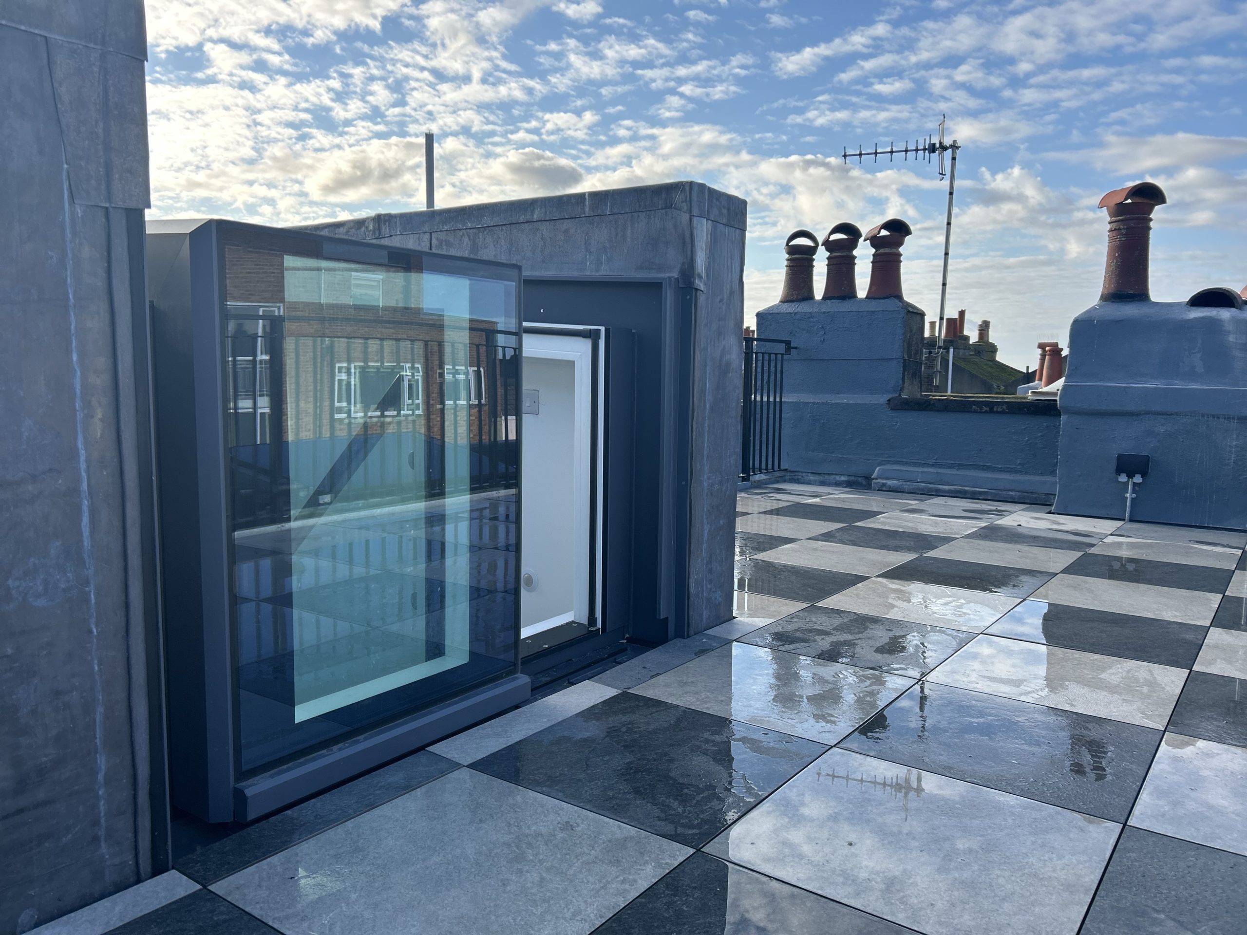 This project adds a roof terrace to the top of a modern town house.  It is accessed by a continuation of the existing stair flight and has an automatically opening long rooflight opening up onto the terrace.  Again a wonderful space with far reaching views has been created.  We are now working for other neighbours who would like to create a similar resource.
