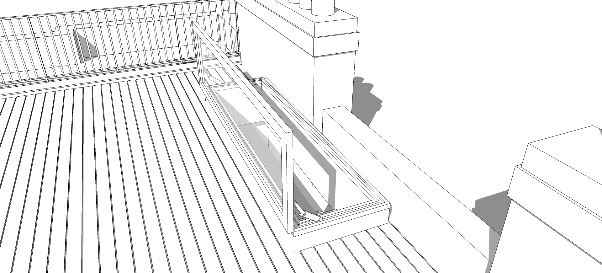 This project adds a roof terrace to the top of a modern town house. It is accessed by a continuation of the existing stair flight and has an automatically opening long rooflight opening up onto the terrace. Again a wonderful space with far reaching views has been created. We are now working for other neighbours who would like to create a similar resource.