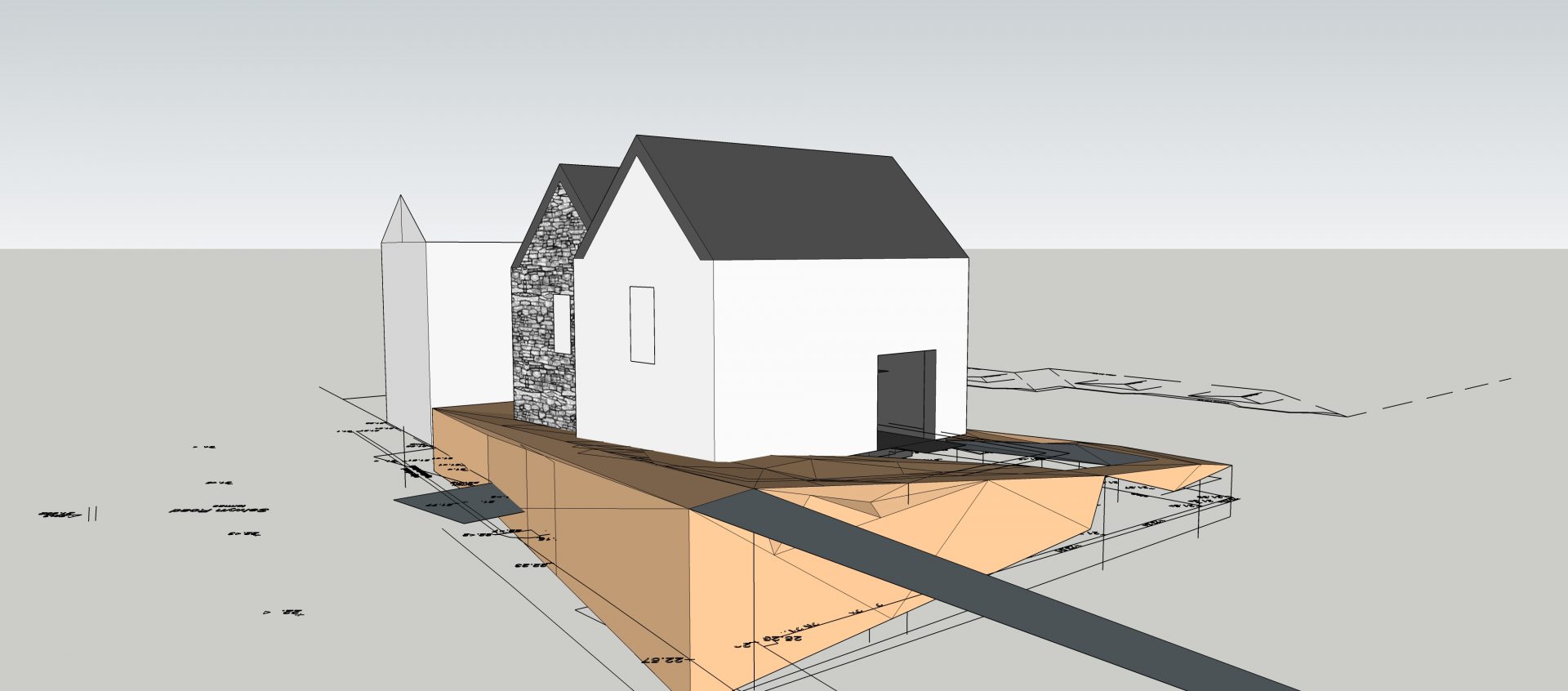 The site was sloped front to back, and this the rear of the property was significantly lower. By entering on one level in a bungalow, the back of the site would need to be significantly increased in height. Furthermore, an existing historic wall would require demolition. This was a feature of particular interest to me and one which I wanted to preserve. For me, this was not a good approach and a shift began in the design process to explore massing to achieve a two storey building.