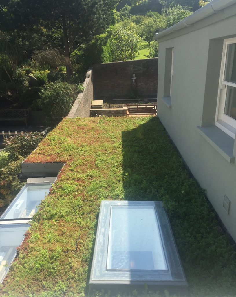 A simple green roof to a side extension with views over into the garden set below also gives the effect of carrying the eye from one green space to another and in this instance in Hastings the garden is backed by the South Downs.